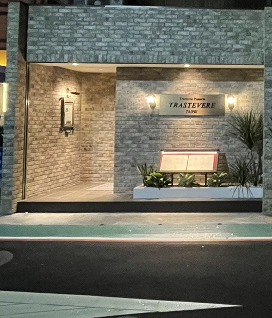 2006年12月「Trattoria Pizzeria TRASTEVERE TAIPEI」在台灣・台北開店。 「提供舒適的環境、讓顧客吃得心滿意足」,克服了國家及文化差異的困難,將義大利飲食文化的精神,從義大利羅馬經由日本東京帶到台灣發揚光大。 舒適優雅寬敞的用餐空間,自在享受美食享受人生。 店內提供義大利麵、現烤薄皮披薩、燉飯、排餐、自製甜點、咖啡、酒類等各式義大利傳統料理,一個人輕鬆用餐,兩三位享受美食或多人聚餐都歡迎。